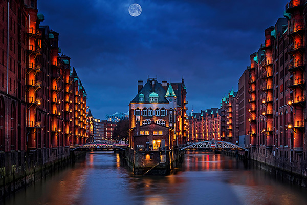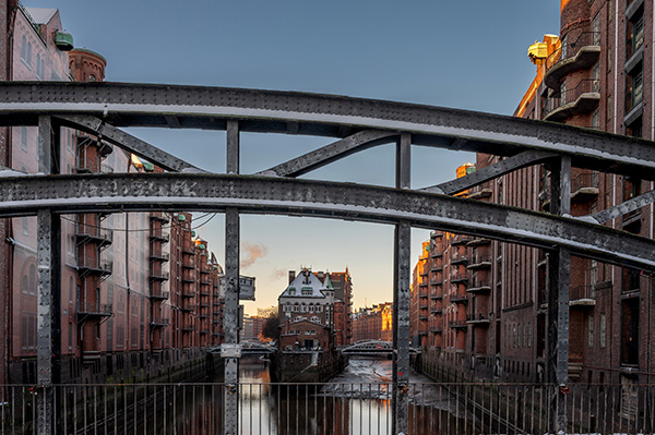Backsteinromantik pur: Die Speicherstadt im warmen Abendlicht